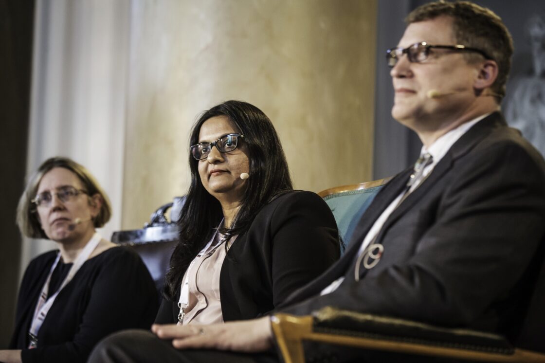 Från vänster: Susanna Fellman (professor i business history på Handelshögskolan vid Göteborgs universitet), Vrunda Pathare (chefsarkivarie på Godrej Archives, Indien) och Erik Rau (Hagley Museum and Library, USA). Foto: Linus Sundahl-Djerf